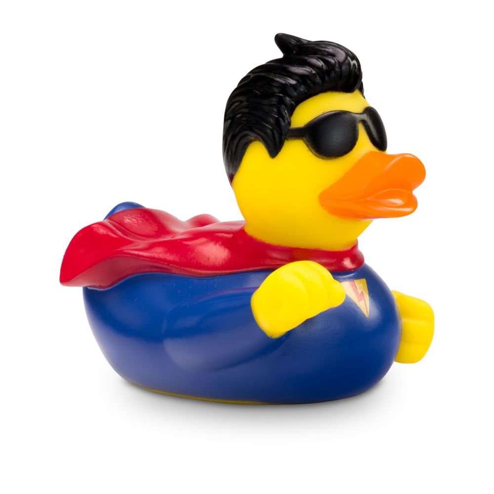 Hier kommt ein echter Held: Superduck ist stets zur Stelle, wenn Hilfe gefragt ist. Er trägt seinen blauen Superheldenanzug mit Blitz-Print und seinen roten Umhang voller Stolz. Eine Badeente die besonders Kindern Mut macht und in schwierigen Zeiten Halt gibt. Größe: ca. 8 cm. Inklusive Quietschventil