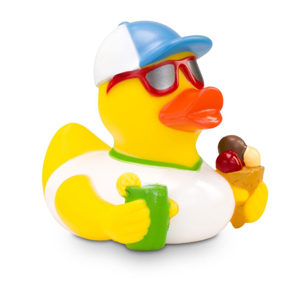 Simon Sommer ist der Sonnenkönig schlechthin. Mit cooler Sonnenbrille, lässiger Cap und weißem Shirt stürzt er sich in den Sommer. Damit er bei den Temperaturen nicht überhitzt, schlürft er ein leckeres Eis und einen erfrischenden Drink mit Zitrone. So genießt er den Sommer in vollen Zügen. Größe: ca. 8 cm. Inklusive Quietschventil