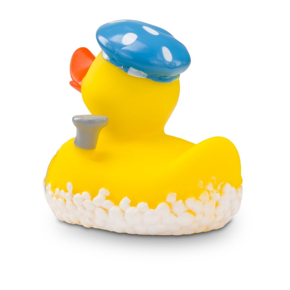 Berta Brause und ihre Dusche - das passt einfach. Die Badeente trägt eine blaue Badehaube mit hellblauen Tupfen, einen Duschkopf am rechten Flügel und weiße Schaumblasen um den Körper. So ist Berta für jedes Bade- und Duschabenteuer zu haben. Ideal als lustiges Giveaway zu den Themen Wellness, Wasser und Sanitär. Größe: ca. 8 cm. Inklusive Quietschventil