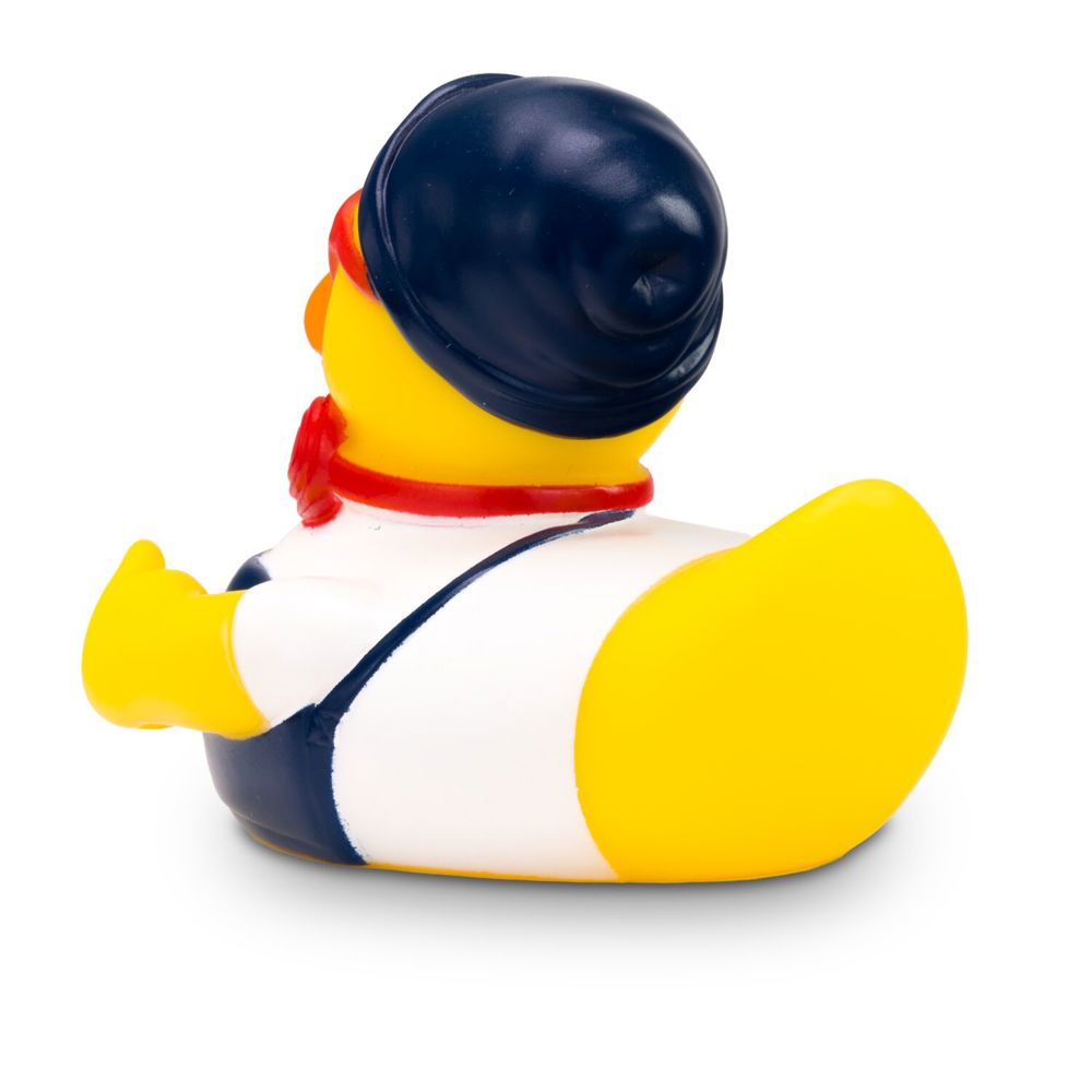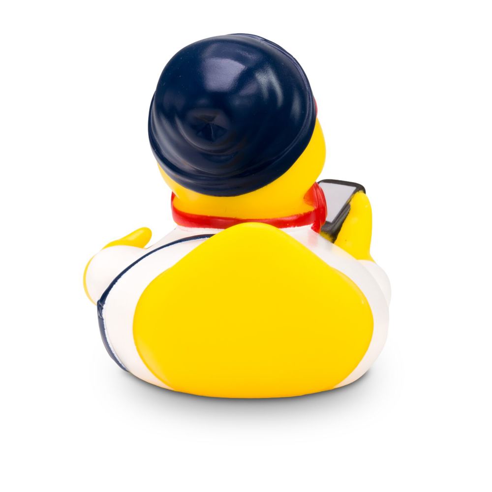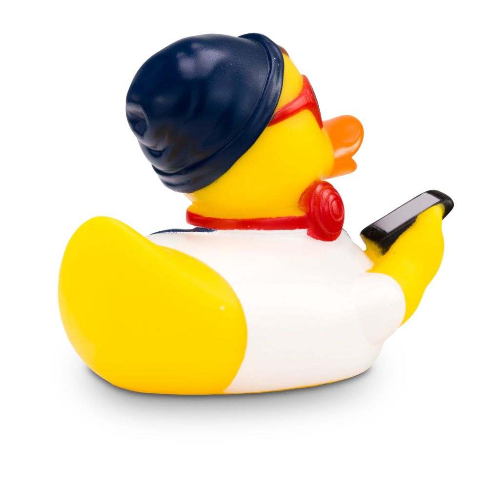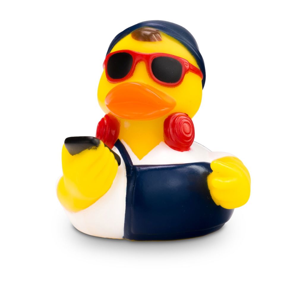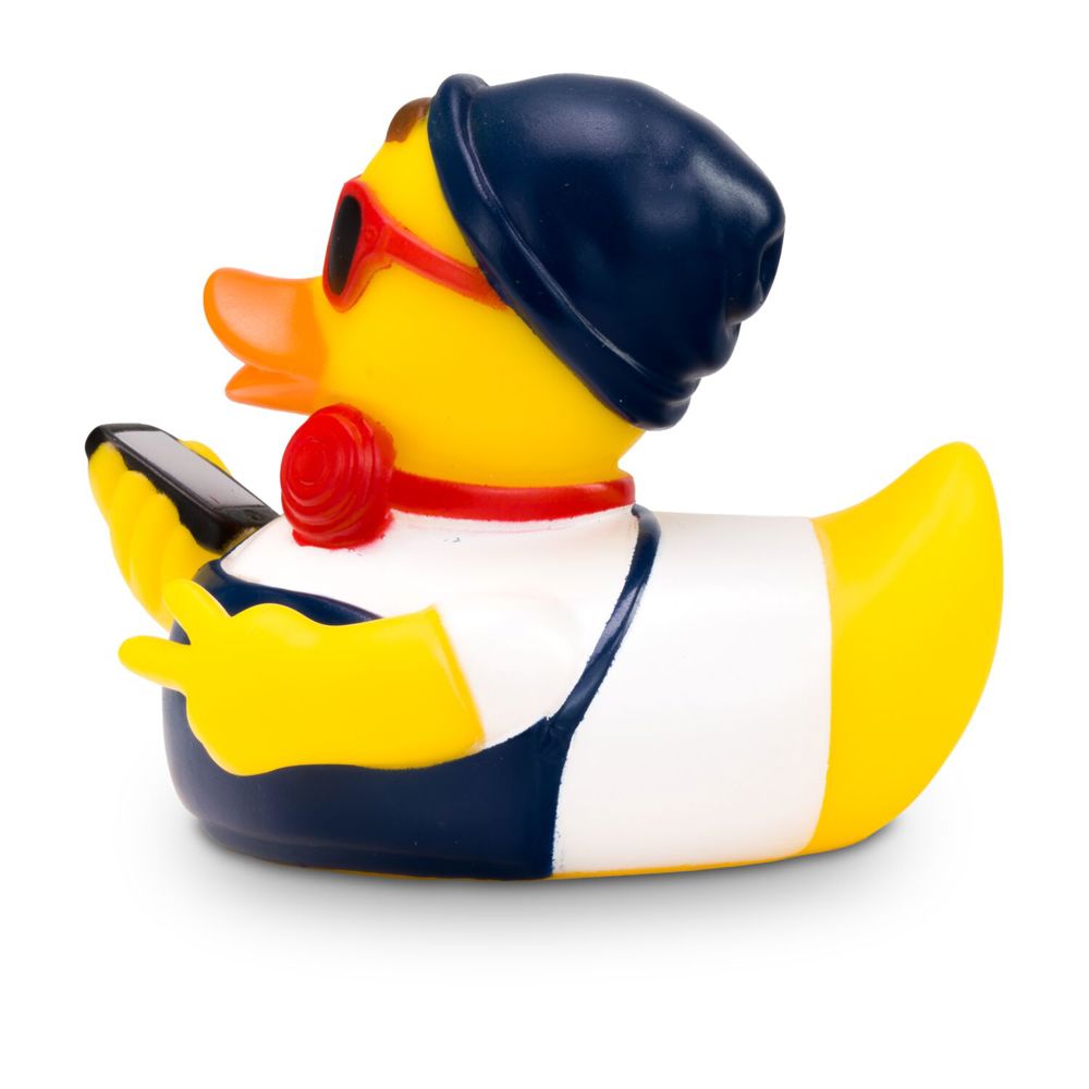 Werbeente Hannes Hipster ist modern unterwegs. Er trägt ein weißes Shirt mit blauer Latzhose und passender Mütze in blau. Um seinen Hals trägt er rote Kopfhörer, auf der Nase eine rote Sonnenbrille und im Flügel ein brandneues Smartphone. Größe: ca. 8 cm. Inklusive Quietschventil