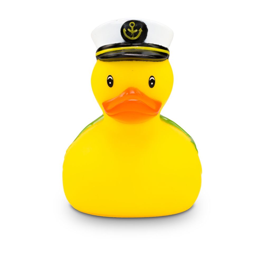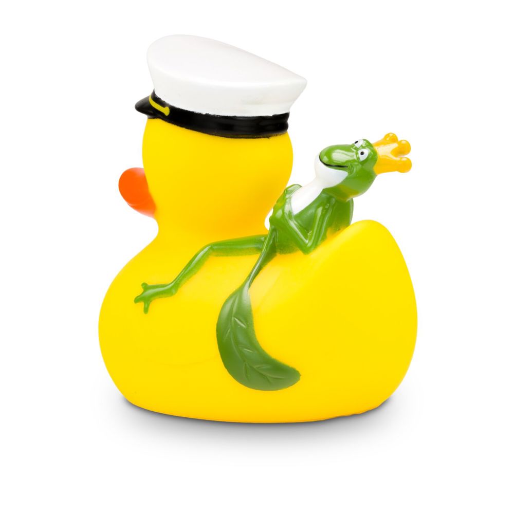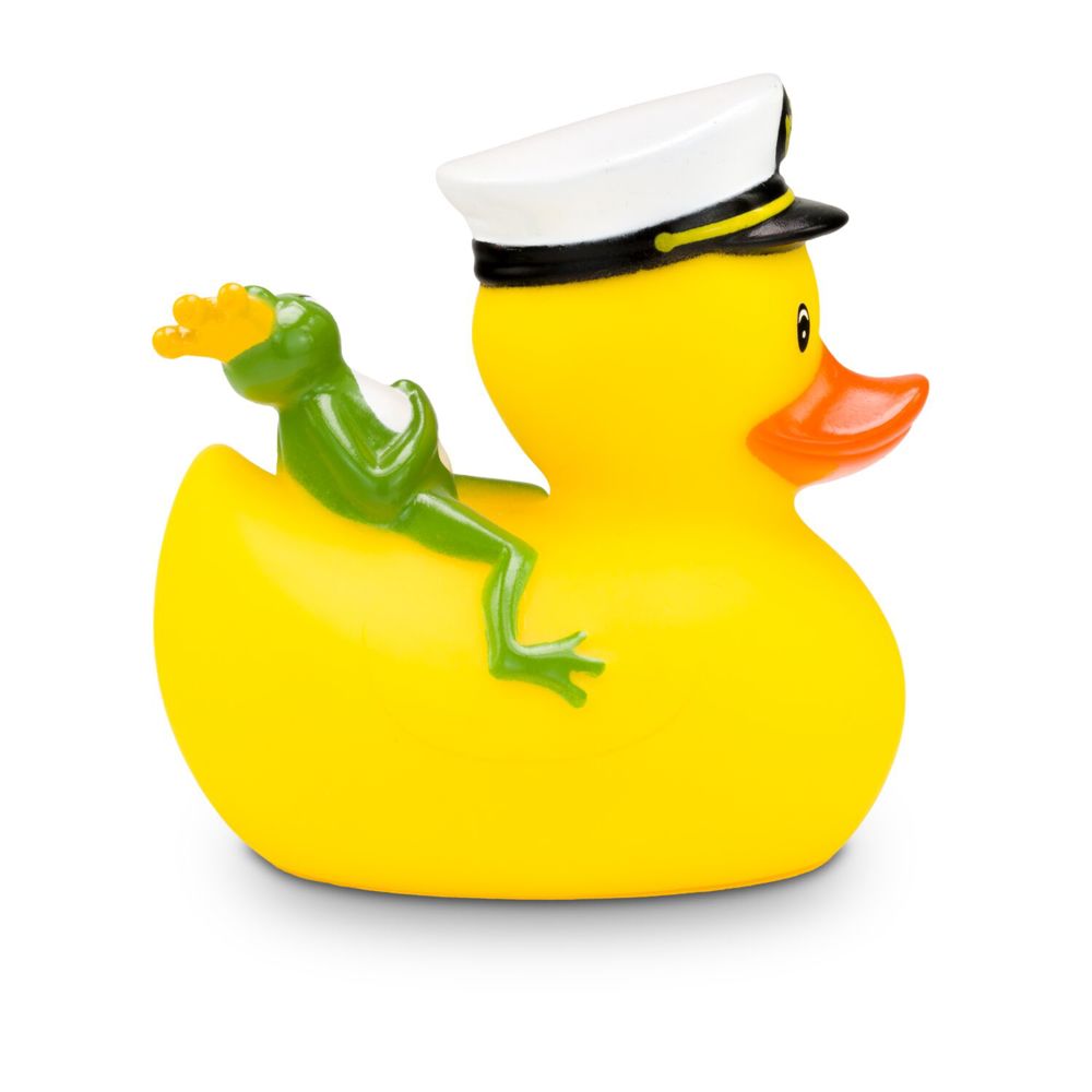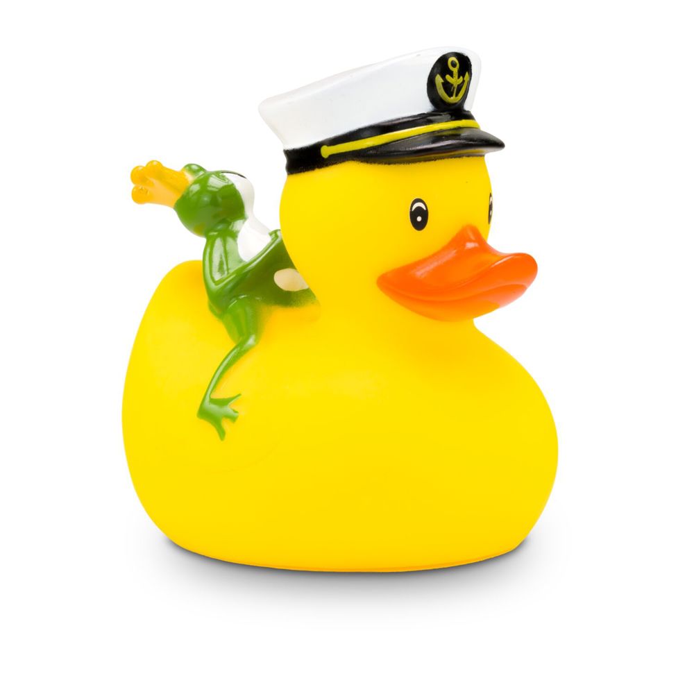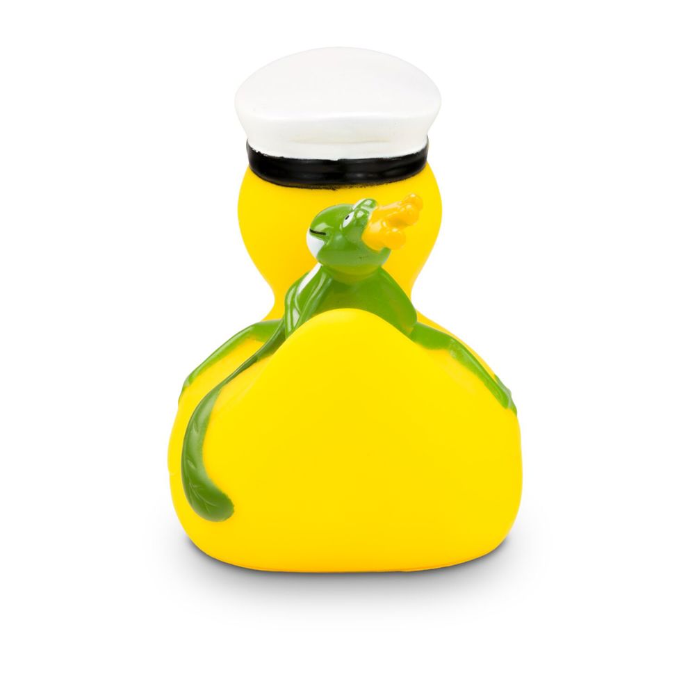 Die maritime Quietscheente mit besonderem Reise-Begleiter. Karl Kapitän trägt stolz seine Kapitänsmütze mit Goldankersymbol, während sich der kleine grüne Froschkönig entspannt auf seinem Rücken ausruht. Diese detailreiche Badeente ist das perfekte Geschenk für Seefahrer, Märchenfans, oder als origineller Werbeartikel für Kreuzfahrten und maritime Events. Größe: ca. 8 cm. Inklusive Quietschventil