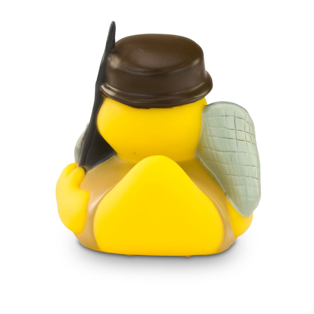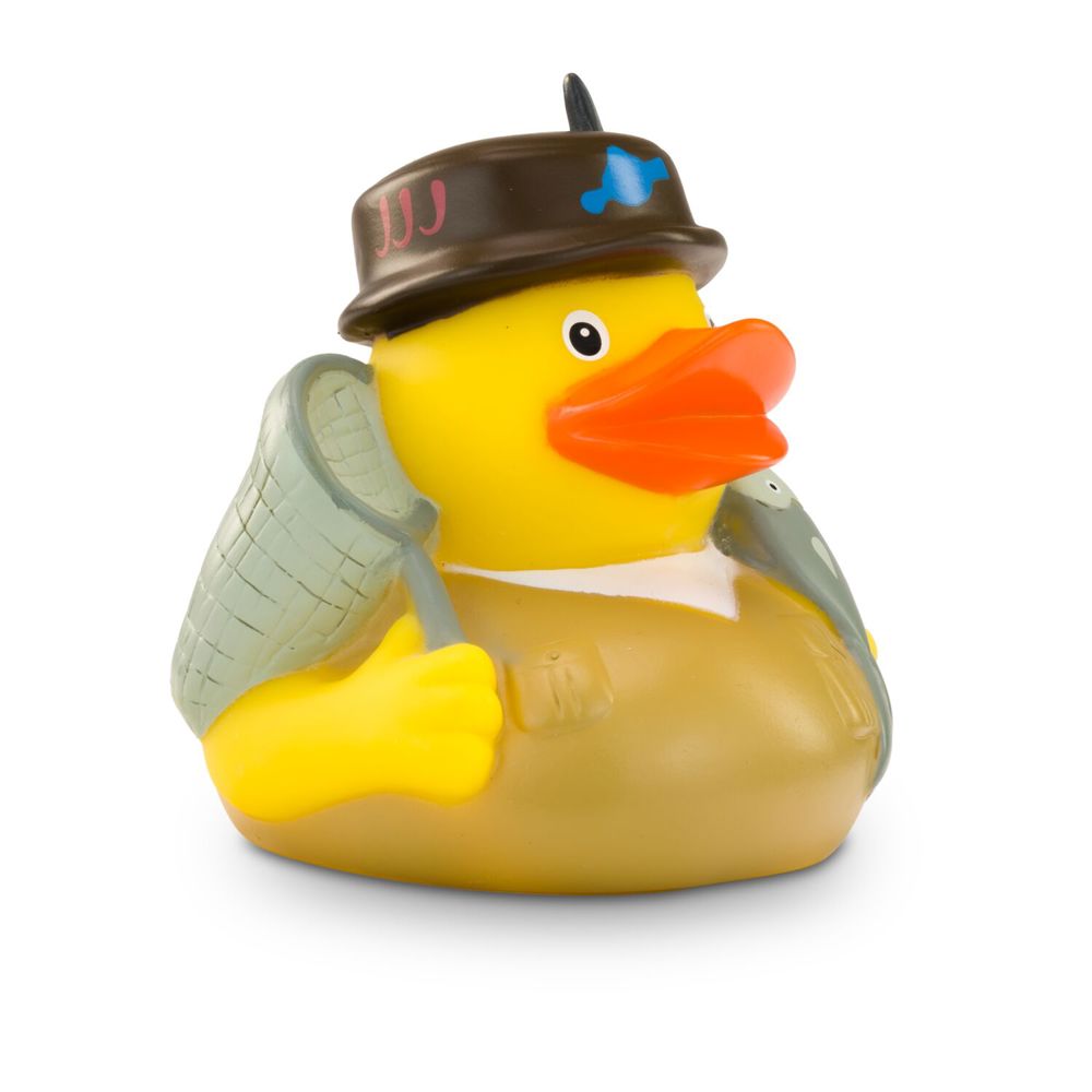 Die Ente Petri Heil ist ein taltentierter Angler. Sie angelt für ihr Leben gerne, trägt dabei einen traditionellen Anglerhut auf dem Kopf und ein braunes Outdoor-Hemd. Sie hat sogar schon einen Fisch an der Angel hängen. Unter dem anderen Flügel hält sie einen Käscher bereit und wartet mit viel Geduld auf den richtigen Moment. Größe: ca. 8 cm. Inklusive Quietschventil