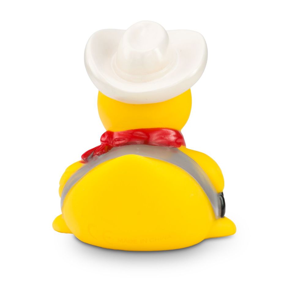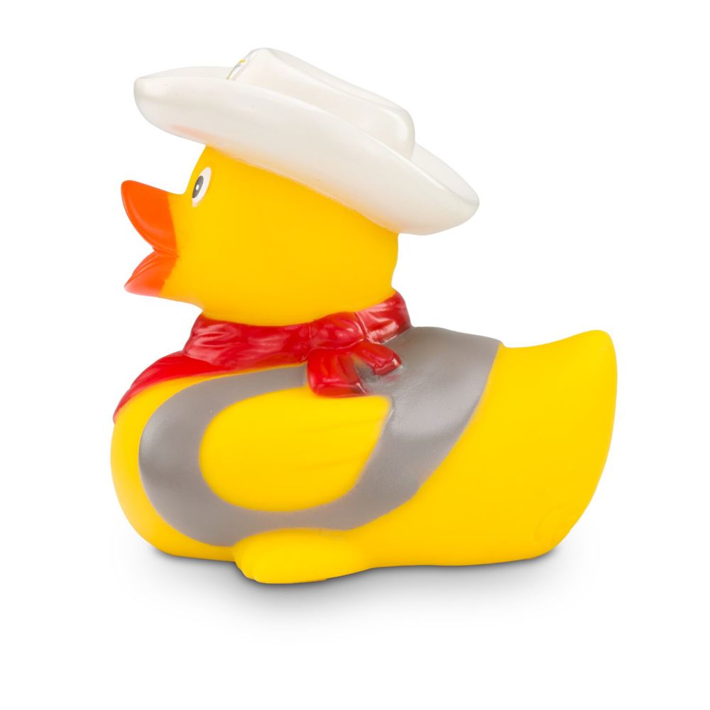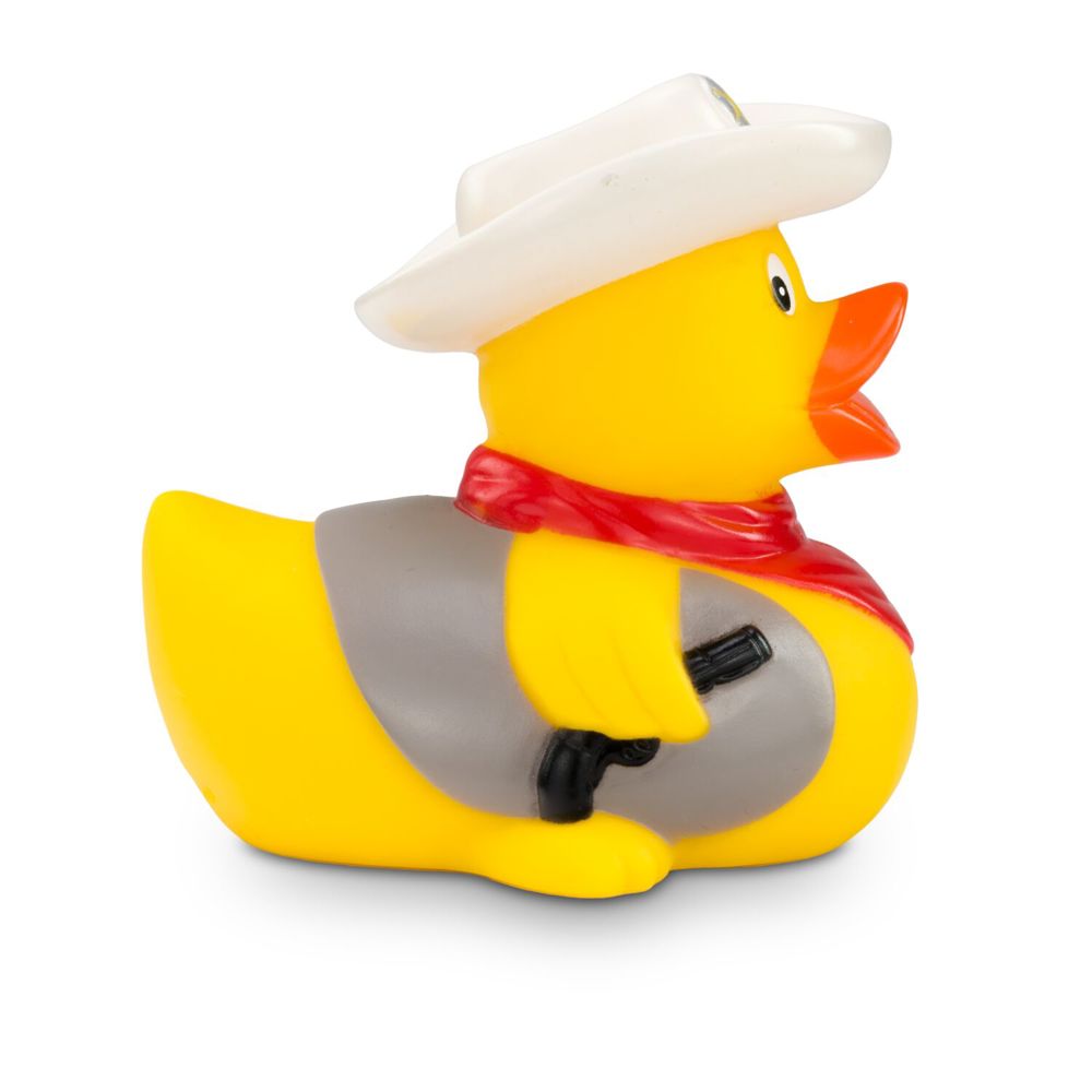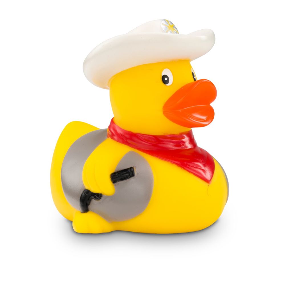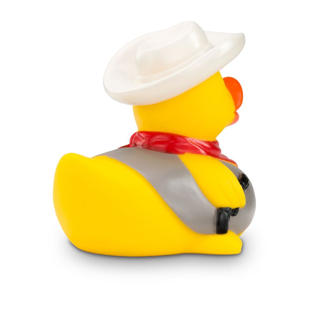 Es gibt einen neuen Sheriff im Ententeich! Colin Colt sorgt für Ordnung und Gerechtigkeit. Mit seinem weißen Cowboyhut und einem roten Halstuch sieht er aus wie eine Ente aus dem wilden Westen. Seine Pistole und die Weste machen das Outfit komplett. Wer zieht schneller? Diese Ente eignet sich ideal als Geschenk für wahre Cowboys. Größe: ca. 8 cm. Inklusive Quietschventil