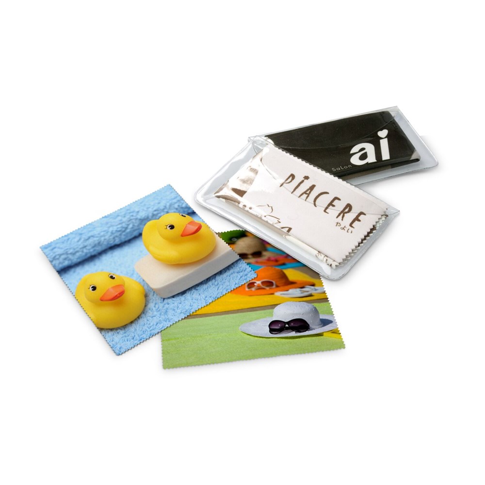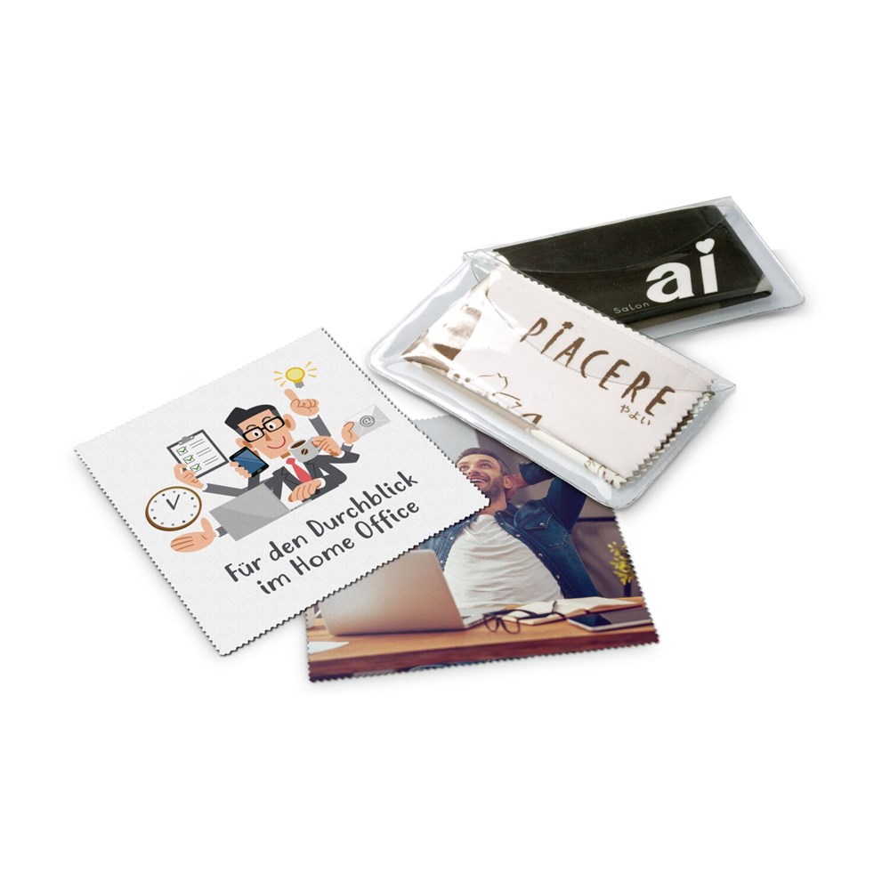Unsere Mikrofasertücher sind ideal zur kratzfreien Reinigung aller glatten Oberflächen, wie Ihren Bildschirm, das Handydisplay oder Ihre Brille. Ein lebendiger Digitaldruck macht dieses leichte und praktische Tuch zu einem genialen und sinnvollen Streuartikel der sich auch wunderbar für ein Mailing oder als Onpack eignet. Unser Preis beinhaltet ein kostenloses Fotofreigabemuster, sodass Sie sicher sein können, dass Ihre Werbung richtig ankommt. Dieser Artikel ist in 4 verschiedenen Größen erhältlich. Zudem können Sie zwischen der Standardvariante oder der rPET Variante aus recyceltem PET wählen. Die Tücher werden im transparenten Schutzetui geliefert. Auf Wunsch auch ohne Verpackung, im Polybeutel oder im Schutzetui mit Klettverschluss erhältlich. Sie möchten einen prägenden Eindruck hinterlassen? Dann sprechen Sie uns an: wir können Ihr Logo auch auf das Tuch prägen lassen! Preise inkl. Druckvor- und Drucknebenkosten!