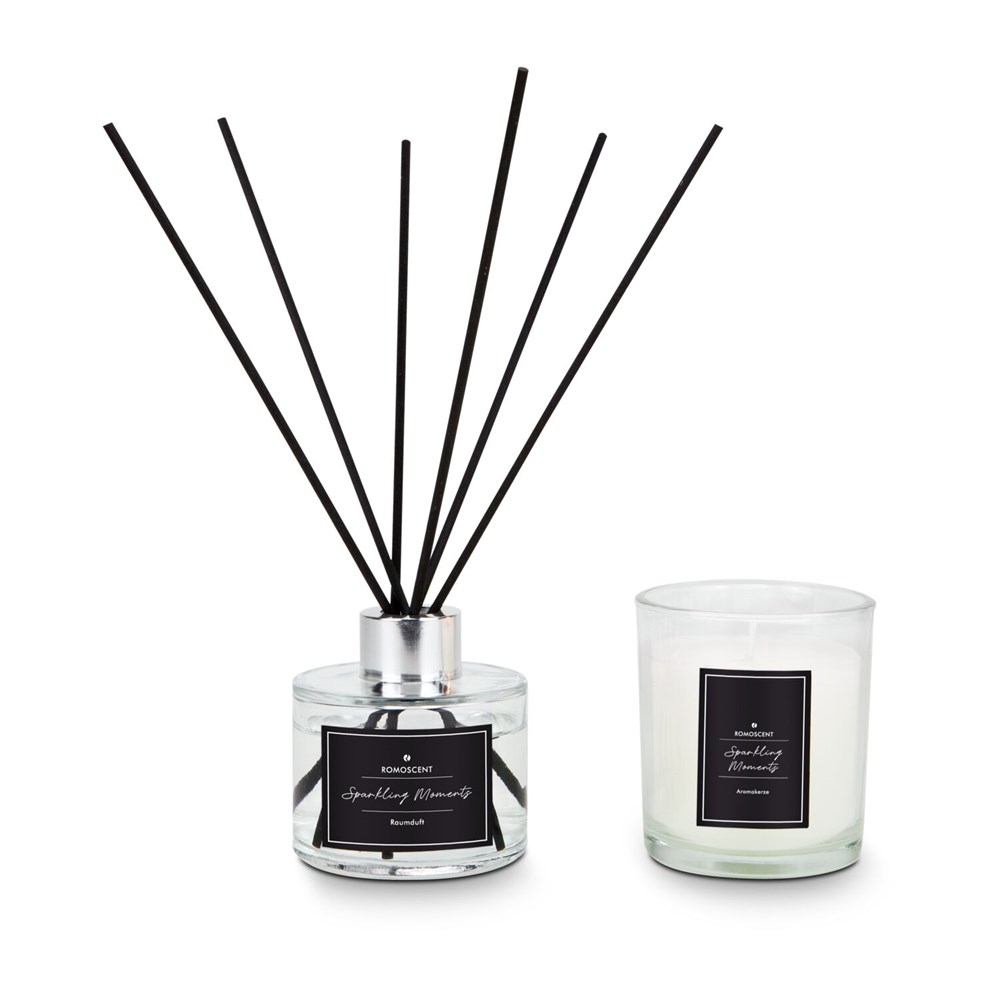 Eine Flasche Champagner ist das Synonym für Luxus. Diese edle Aroma-Kombination, die einen dezenten Duft angelehnt an diesen prickelnden Genuss verbreitet, entführt Sie ganz ohne Alkohol zu Ihrem persönlichen Luxus-Entspannungsmoment. Das elegante schwarz-weiße Set besteht aus einer Duftkerze (ca. 130 g) und einem Raumduft (ca. 80 ml) in einer modernen Geschenkverpackung. Sowohl Raumduft als auch Duftkerze kommen in einem modernen Glas mit zeitlosem Etikett. Der Raumduft erfrischt die Umgebung je nach Raumgröße und -temperatur für ca. 25 Tage. Brenndauer der Kerze ca. 25 Stunden.