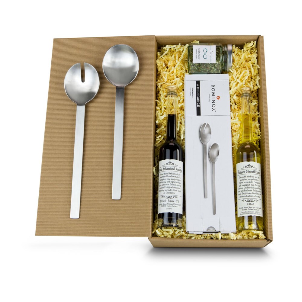 Gesund, fit und lecker präsentiert sich dieser praktisch zusammengestellte, naturfarbene Geschenkkarton. Sie finden darin: ein edles ROMINOX® Salatbesteck aus Edelstahl, harmonisch abgerundet, je 100 ml Aceto Balsamico und Natives Olivenöl Extra, sowie ein Glas mit25 g Salatkräutern.