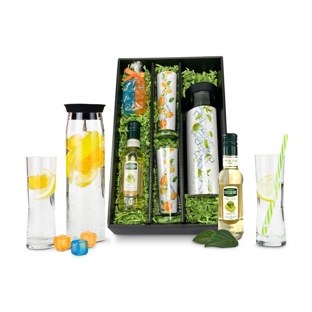 Dieses Set ist etwas für jeden und zu jeder Jahreszeit! Neben einer praktischen ROMINOX® Glaskaraffe (1 l) und 2 passenden Gläsern enthält das Set eine Flasche Sirup Limette (0,25 l) und sechs bunte, wiederverwendbare Eiswürfel im Tütchen. Auf der Rückseite des Karaffeneinlegers befinden sich Rezeptideen für Cocktails und Mocktails. Eine überraschende Idee! Alles liegt optisch wunderschön verpackt in einem Geschenkkarton mit Klarsichtdeckel.
