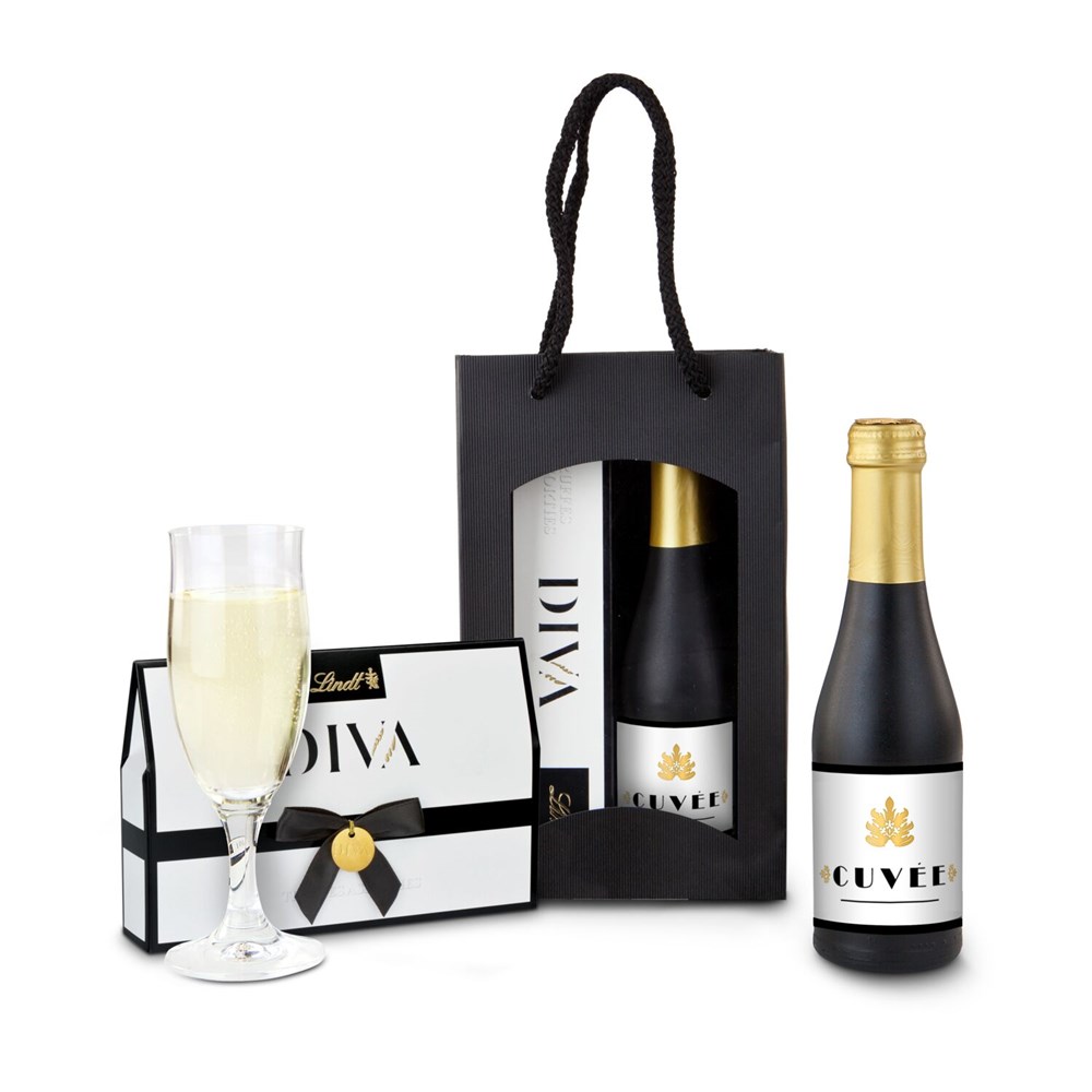Ein wahrhaft luxuriöser Schokoladengenuss: 8 DIVA Trüffelkreationen von Lindt (114 g) - perfekt kombiniert mit einer eleganten schwarz-matten Piccolo-Flasche mit abgestimmter Ausstattung - verpackt in einer schwarzen Sichtfenstertüte mit schwarzer Kordel - direkt zum Überreichen!