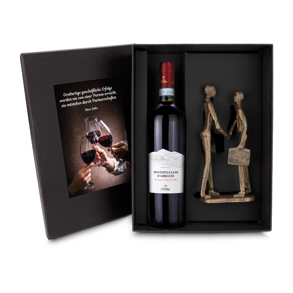 Partnerschaft bleibend ausgedrückt: „Großartige geschäftliche Erfolge werden nie von einer Person erreicht, sie entstehen durch Partnerschaften” (Steve Jobs). Wer dieses Geschenk erhält, versteht die Symbolik sofort und weiß die Geste zu schätzen. Die schwere Eisenfigur passt ideal als Geschenk für viele Anlässe - drücken Sie dem Beschenkten die Freude über eine partnerschaftliche Zusammenarbeit, einen neuen Vertrag oder ein abgeschlossenes Projekt aus. Die Figur kommt zusammen mit einer Flasche Montepulciano d‘Abruzzo (0,75 l) in einem schwarzen Geschenkkarton mit Deckelaufkleber.