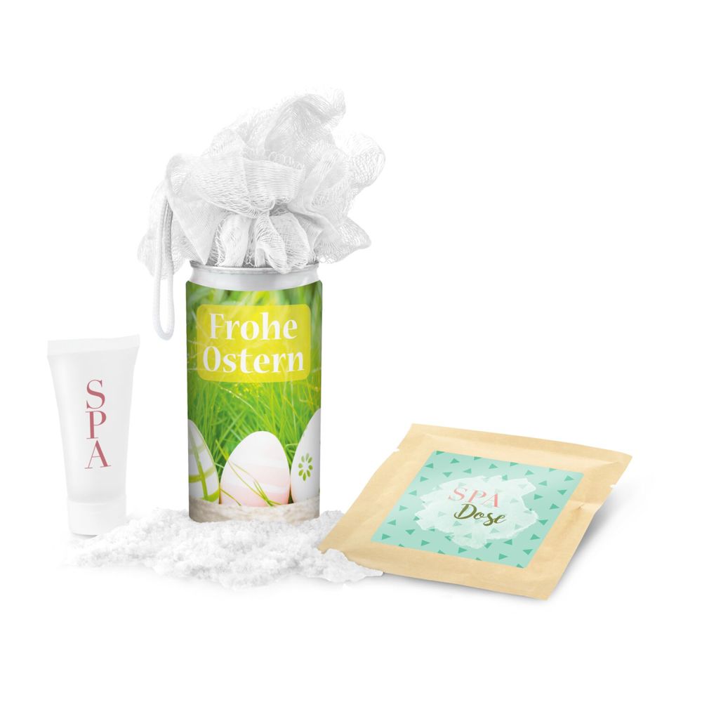 SPA in der Dose! Diese Überraschungsdose ist das perfekte Geschenk für jede Frau. Eine liebevolle Präsentidee zum Osterfest. Eine nette Aufmerksamkeit, die nachhaltig gut tut: ein praktischer und hübscher Mesh-Schwamm, ein Badesalz (ca. 40 g) mit der wohltuenden Botschaft „Zeit für Dich”, dazu ein passendes Duschgel (20 ml). Alles versteckt in einer pfiffigen Geheimnisdose, welche schon beim Öffnen ein Lächeln auf das Gesicht zaubert! Mit verschiedenen Ostergrüßen.