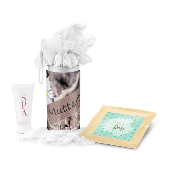 SPA in der Dose! Diese Überraschungsdose ist das perfekte Geschenk für jede Frau. Nicht nur für den Muttertag oder zum Valentinstag eine liebevolle Präsentidee. Eine nette Aufmerksamkeit, die nachhaltig gut tut: ein praktischer und hübscher Mesh-Schwamm, ein Badesalz (ca. 40 g) mit der wohltuenden Botschaft „Zeit für Dich“, dazu ein passendes Duschgel (20 ml). Alles versteckt in einer pfiffigen Geheimnisdose, welche schon beim Öffnen ein Lächeln auf das Gesicht zaubert!