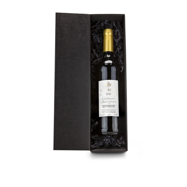 Ein Klassiker in modernem Gewand: Eine Flasche französischer Cabernet Sauvignon (0,75 l) gebettet auf schwarzem Sizzle in einem schwarzen Geschenkkarton. Damit treffen Sie jeden Geschmack und Weinfreunde werden den harmonischen Rotwein zu schätzen wissen!