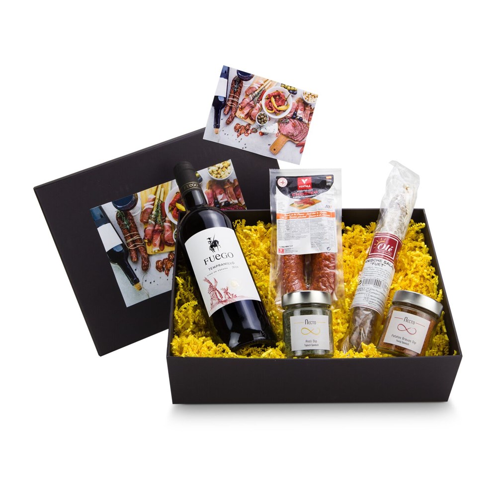 ¡Viva España! Erkunden Sie Spanien von seiner kulinarischen Seite: Chorizo Wurst (250 g), Salami Fuet (180 g), 1 Aioli Dip (70 g), 1 Patatas Bravas Dip (70 g) und ein spanischer Fuego Rotwein (0,75 l) bringen den Geschmack von Spanien zu Ihnen nach Hause. Ein Rezeptkärtchen mit Zubereitungshinweisen sowie der schwarze Geschenkkarton mit gelbem Sizzle und Deckelaufkleber runden das Set ab.