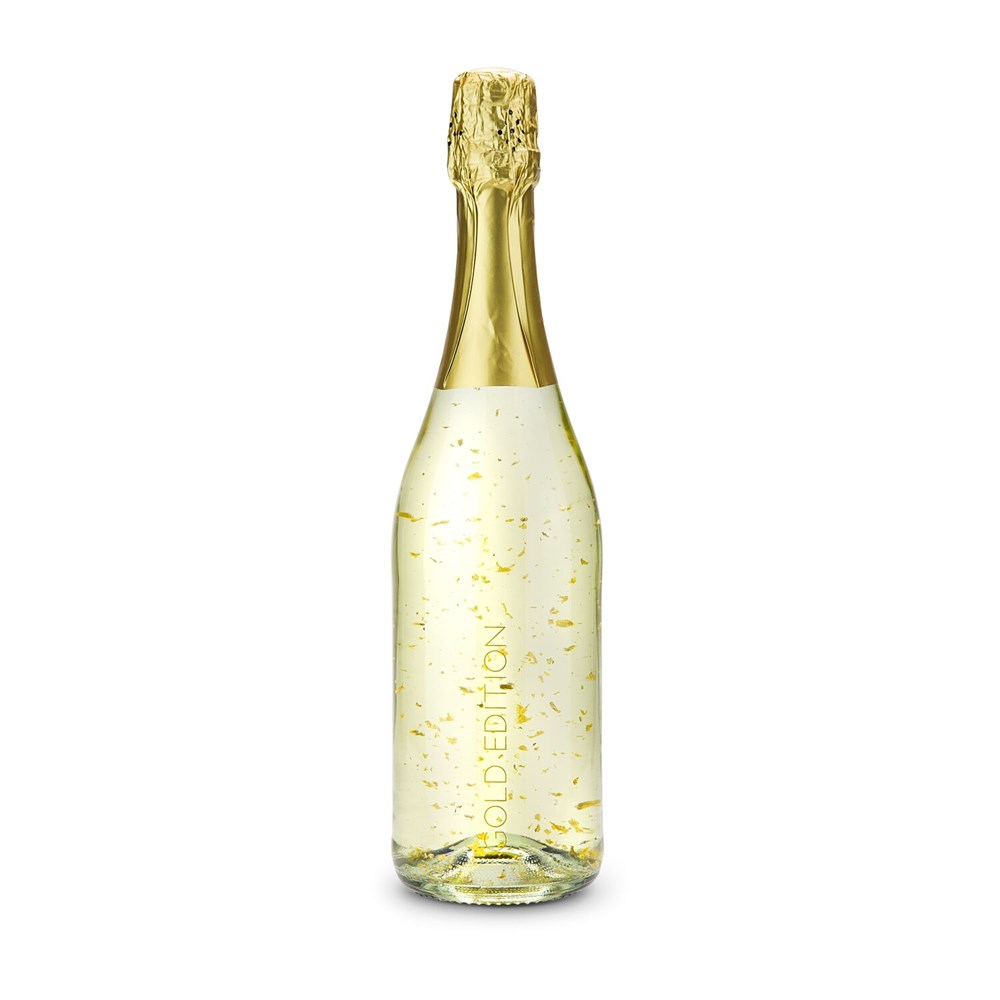 Überzeugen Sie mit goldener Eleganz: Dieser exklusive trockene Sekt enthält echtes 22-karätiges Blattgold. Unweigerlich zaubern Sie mit diesem besonderen Geschenk ein Lächeln in das Gesicht Ihrer Kundinnen und Kunden. Sie erhalten eine klare Flasche Goldflockentraum (0,75 l, aromatisiertes, schaumweinhaltiges Getränk) mit Druck „Gold Edition“, gebettet auf schwarzem Sizzle und verpackt in einem goldenen Karton.