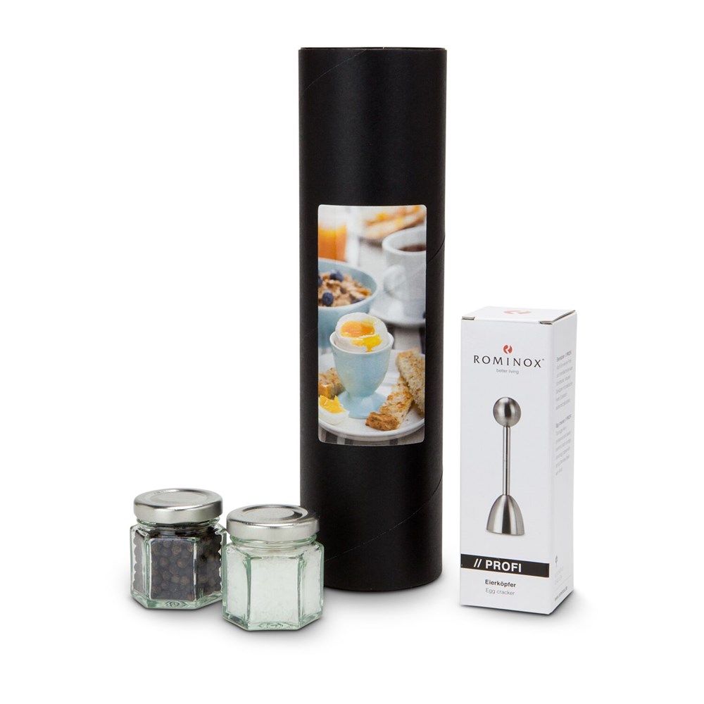 Das Frühstück ist bekanntlich die wichtigste Mahlzeit des Tages. Für viele gehört da ein perfektes Frühstücksei auf den Tisch. Diese Geschenkröhre beinhaltet neben je einem Gläschen Salz (ca. 40 g) und Pfeffer (ca. 20 g) einen ROMINOX® Eierköpfer aus Edelstahl mit Feder. So macht Eierköpfen Spaß und Sie können das perfekte Frühstücksei genießen. Guten Appetit!