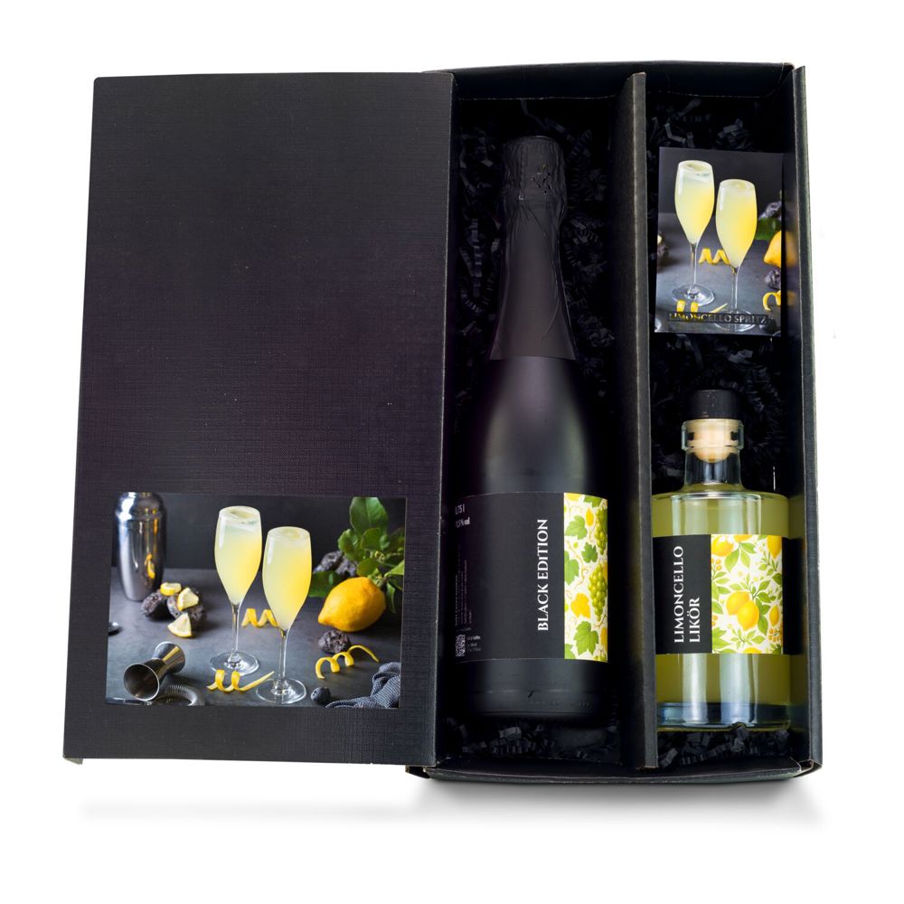 Mit diesem Geschenkset entführen Sie Ihre Kunden, Mitarbeiter oder Geschäftspartner an die sonnengeflutete Küste Italiens. Lassen Sie sich von einem leckeren Limoncello Spritz erfrischen - dem Trend-Getränk für gesellige Sommerabende. Für Ihren leckeren Cocktail erhalten Sie einen stilvollen Rezeptflyer, der Ihnen zeigt, wie Sie den enthaltenen Villa Römer Sekt (0,75 l) in der edlen schwarzen Flasche mit dem authentischen Limoncello (0,35 l) zu einem leuchtend gelben angesagten Sommerdrink verwandeln. Die erfrischende Kombination aus zitroniger Säure und lieblicher Likörsüße gepaart mit prickelnder Kohlensäure entführt Sie in Ihrem Feierabend direkt ans mediterrane Meer. Das Cocktail-Set ist stilvoll in einem schwarz-matten Geschenkkarton mit schwarzem Füllmaterial und stimmungsvollem Limoncello-Spritz Aufkleber verpackt. Auf Wunsch können die Etiketten und/oder der Aufkleber auch individuell gestaltet werden. So bringen Sie „Dolce Vita“ nach Hause - nicht nur im Sommer!