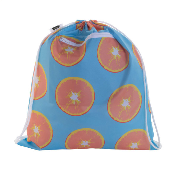 Individueller Turnbeutel mit Kordelzug und Fach mit RFID-Schutz mit Reißverschluss, Material: 190T RPET-Polyester. Der Preis ist inkl. Sublimationsdruck und RPET-Label. Mindestmenge: 25 Stk.