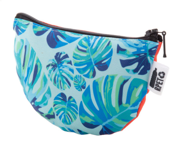 Individuelle, halbrunde Reißverschluss-Geldbörse aus 600D RPET Polyester mit vollflächigem Sublimationsdruck und RPET-Label. Mindestmenge: 50 Stk.