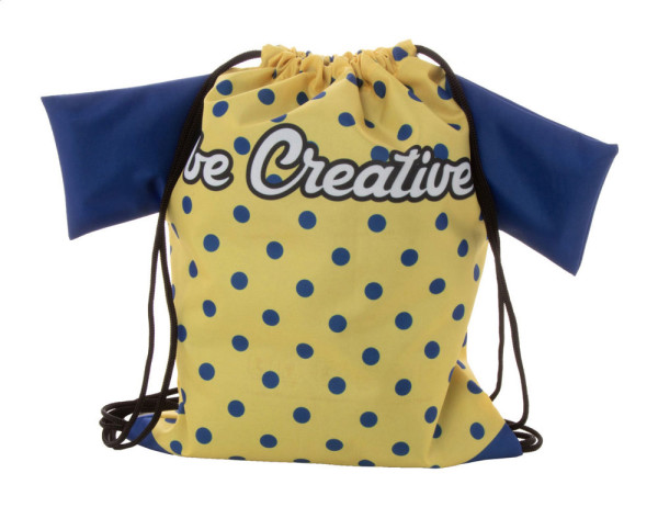 Individuelles Turnbeutel in T-Shirt-Form für Kinder mit farbigen Kordeln, Material: 190T Polyester. Der Preis ist inkl. vollflächigem Sublimationsdruck. Mindestmenge: 25 Stk.