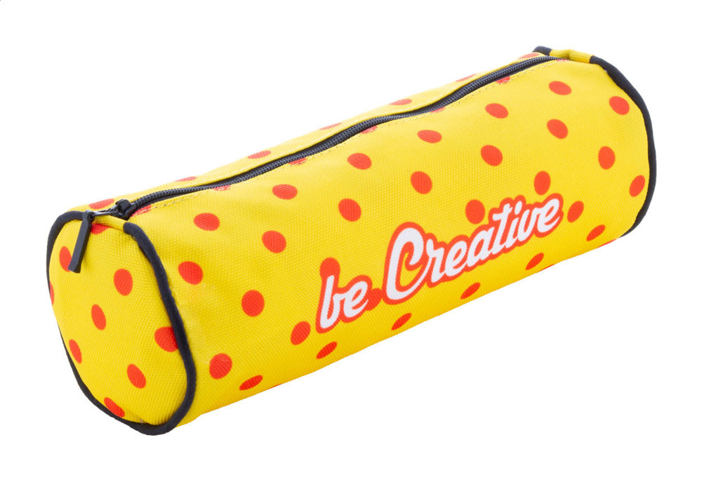 Individuelle, runde Reißverschluss-Stiftetasche aus 600D RPET Polyester mit vollflächigem Sublimationsdruck und RPET-Label. Mindestmenge: 50 Stk.