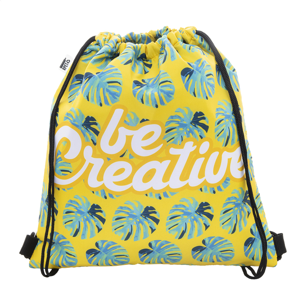 Individuelle Kühltasche mit Kordelzug, hergestellt aus 600D RPET-Polyester mit Aluminium-Polsterung. Mit vollflächigem Sublimationsdruck. Mit RPET-Label. Mindestmenge: 25 Stk.