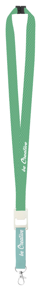 Individuelles Polyester-Lanyard mit Metallkarabiner, Flaschenöffner und Panikverschluss. Der Preis ist inkl. Sublimationsdruck auf beiden Seiten. Mindestmenge: 100 Stk.