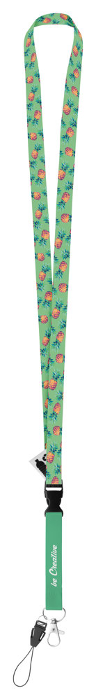 Individuelles Lanyard aus RPET, 15mm breit, mit abnehmbaren Metallkarabiner und Handyfaden. Der Preis ist inkl. Sublimationsdruck auf beiden Seiten. Mindestmenge: 100 Stk.