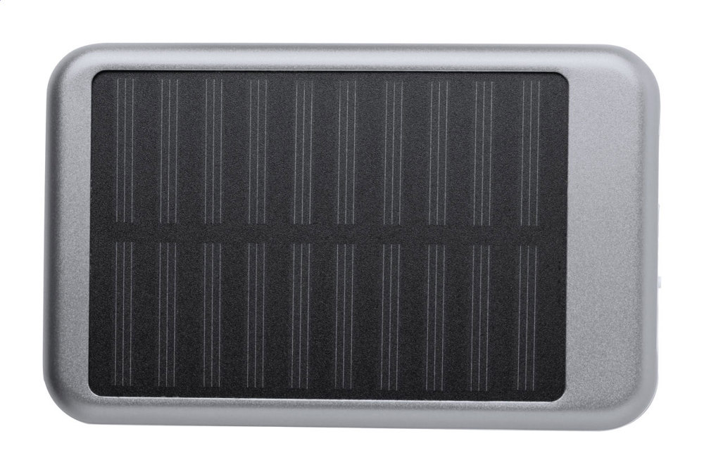 Powerbank aus Aluminium eingebautem Solar-Ladegerät. Akkukapazität: 4000 mAh. Inkl. USB-Ladekabel.