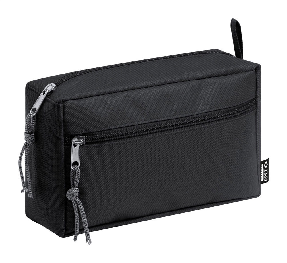 Kosmetik-Tasche aus RPET mit zwei Reißverschluss-Fächern. Mit RPET-Label.