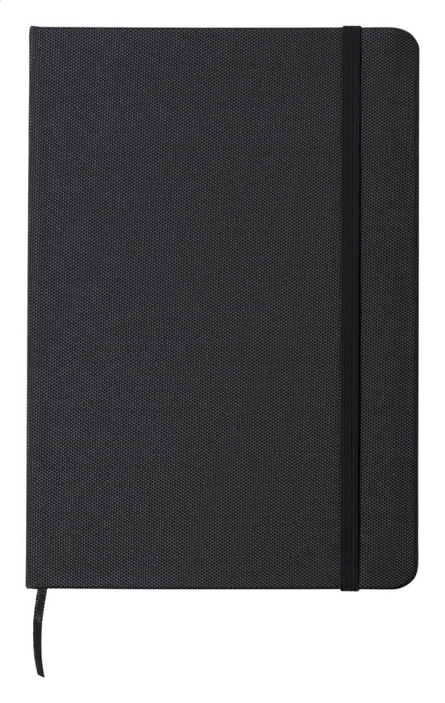 Notizbuch mit RPET-Polyester überzogen, mit 80 Seiten (liniert), Lesezeichen und Gummiband. Größe A5.