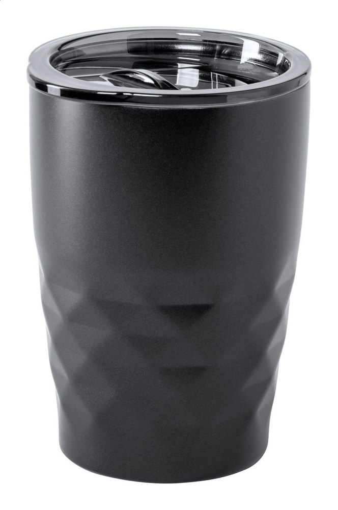 Doppelwandiger, vakuumisolierter Thermobecher aus Edelstahl und Kupfer mit Trinkdeckel aus Kunststoff. Füllmenge: 350 ml. Die Kupferisolierung hält Getränke ca. 12 Stunden lang heiß und ca. 24 Stunden lang kühl.