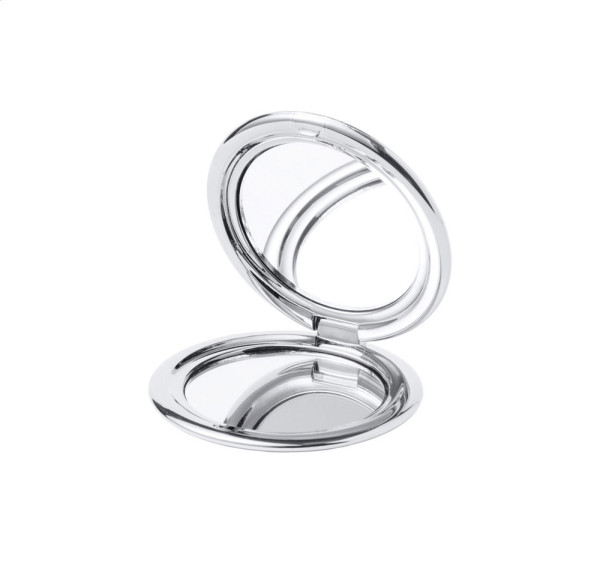 Taschenspiegel aus ABS Kunststoff mit Metallic-Oberfläche, mit einer normalen und einem Vergrößerungsspiegel.
