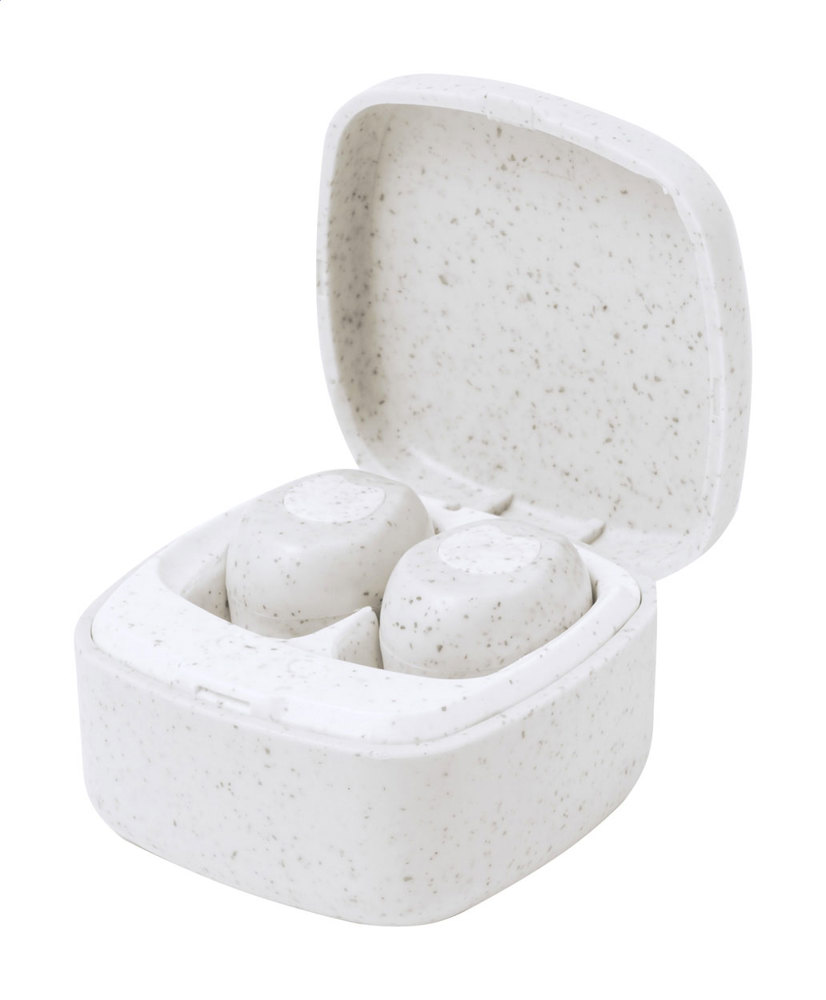 Ökologischer Weizenstroh-Kunststoff, kabellose Stereo-Ohrhörer (TWS) mit Freisprechfunktion im Ladeetui. Inklusive USB-Ladekabel.
