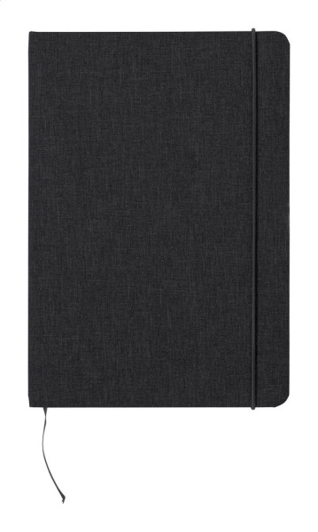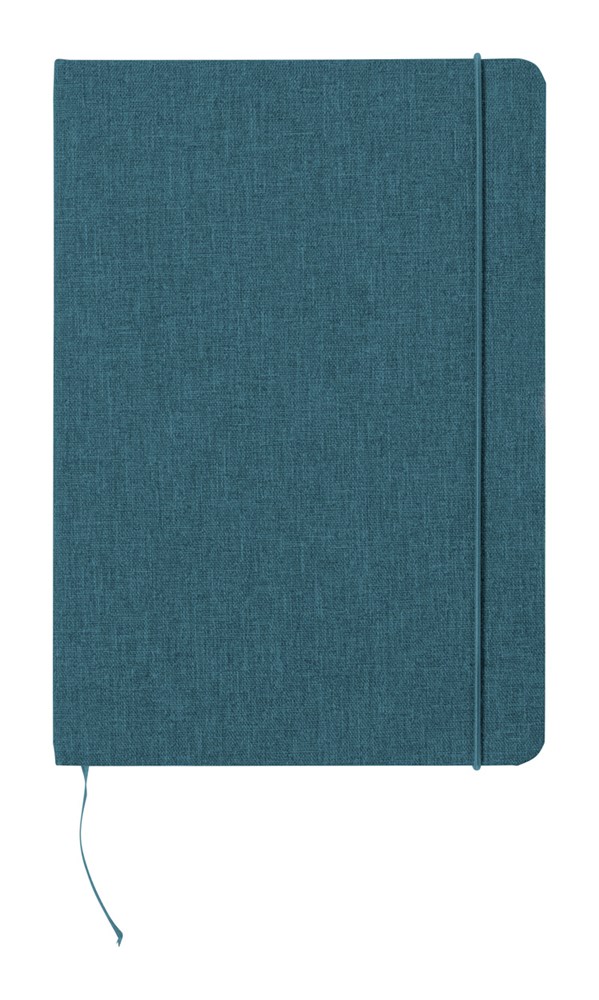 A5 Notizbuch mit Cover aus 300D RPET Polyester mit 80 blanko Seiten und farblich abgestimten Gummiband, Lesezeichen sowie Stifteschlaufe.