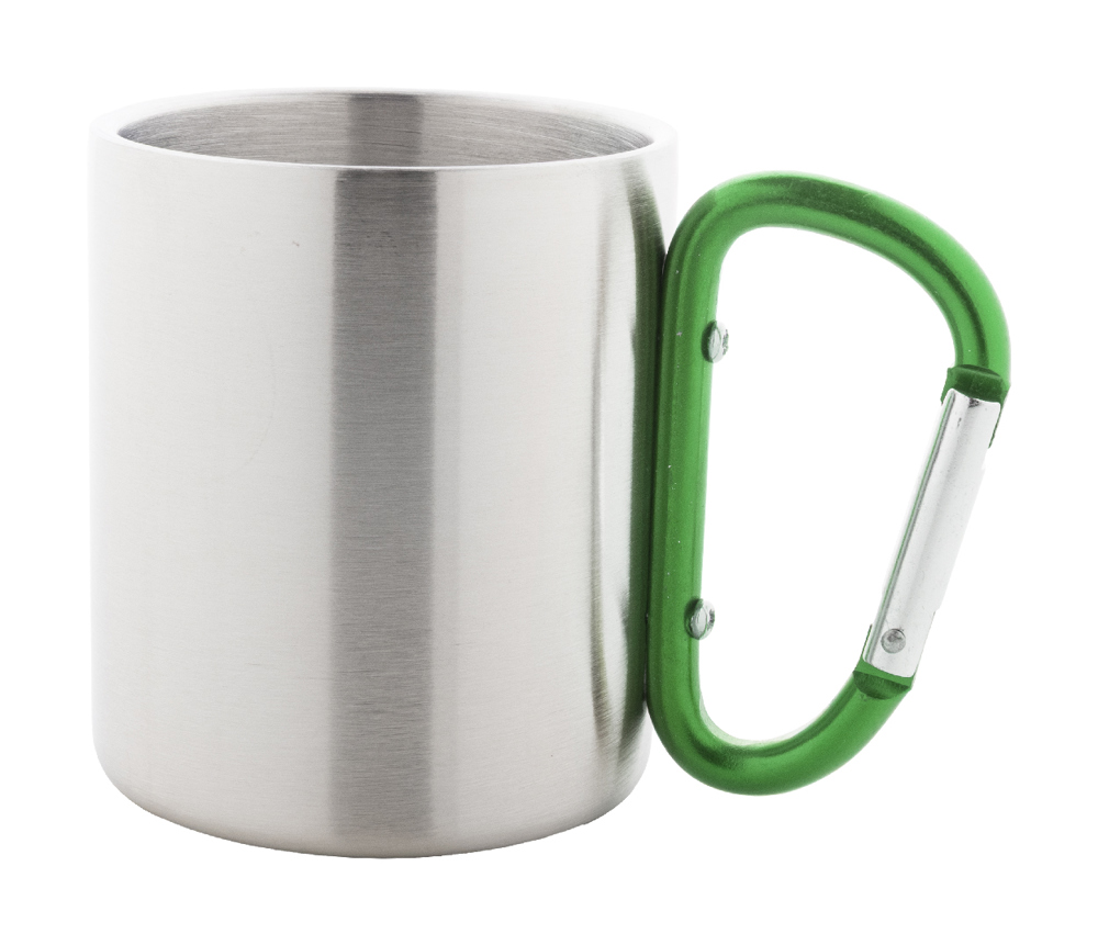 Edelstahlbecher mit farbigem Karabinergriff. Füllmenge: 200 ml.