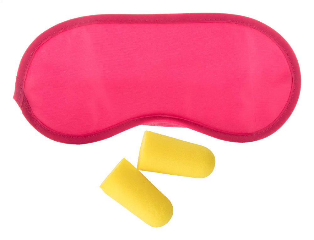 Reiseset mit Schlafmaske (Material: Mikrofaser) und Ohrstöpsel (Material: EVA).