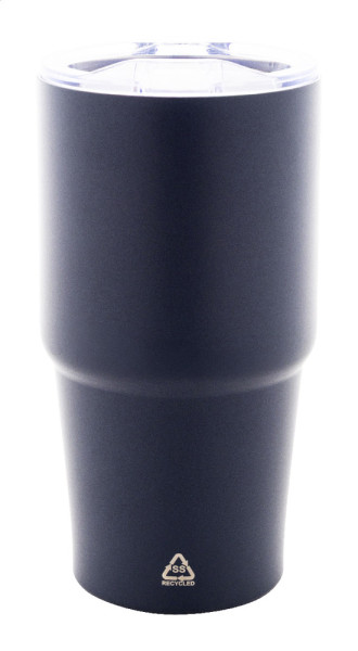 Doppelwandiger, vakuumisolierter Thermobecher aus recyceltem Edelstahl mit Trinkdeckel aus PS-Kunststoff. Füllmenge: 600 ml.