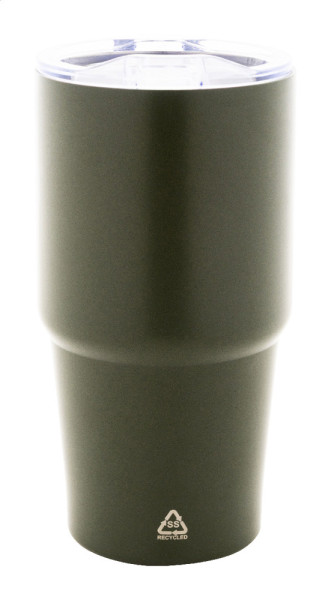 Doppelwandiger, vakuumisolierter Thermobecher aus recyceltem Edelstahl mit Trinkdeckel aus PS-Kunststoff. Füllmenge: 600 ml.