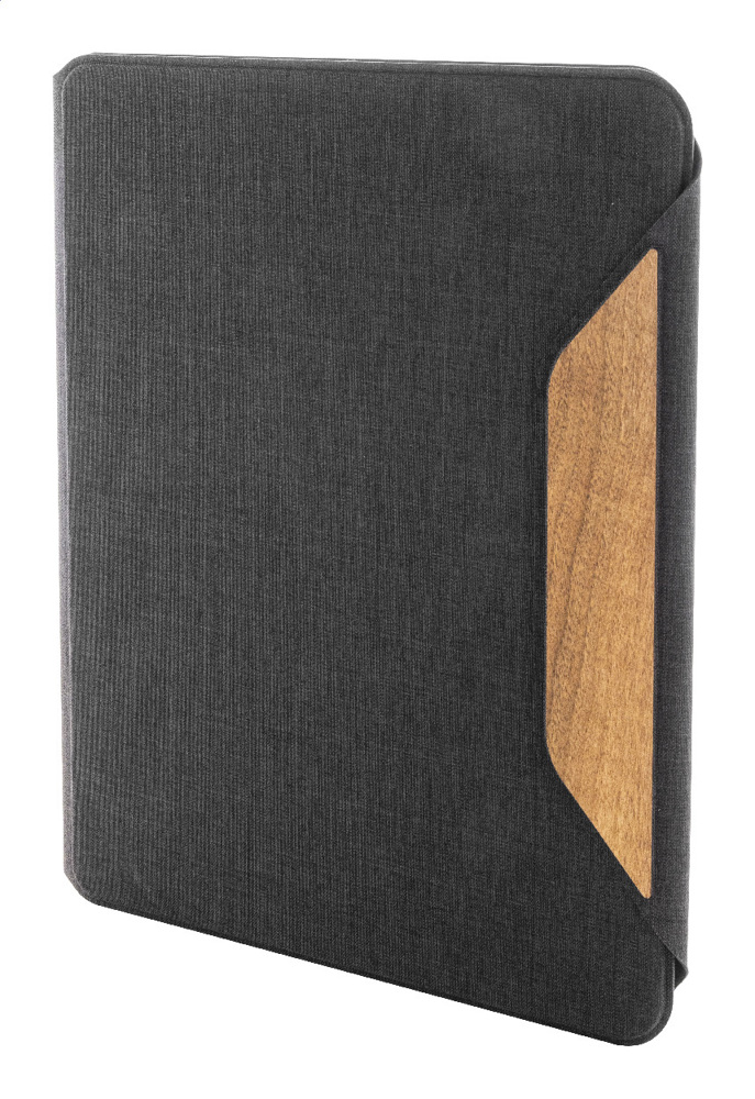 Dokumentenmappe im A4-Format aus RPET-Polyester mit Walnussholzdetails, mehreren Organizer-Innentaschen und Magnetverschluss. Inklusive Notizblock mit 20 linierten Seiten aus Recyclingpapier.