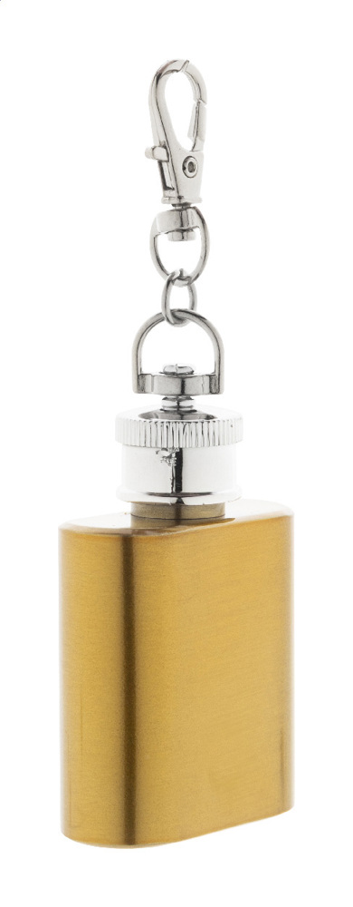 Mini-Flachmann aus recyceltem Edelstahl mit glänzendem Metallic-Oberfläche und Karabiner-Schlüsselring. Füllmenge: 30 ml.
