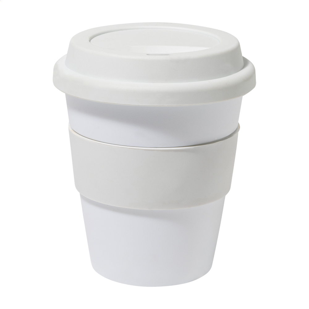 Einwandiger Reisebecher aus PP mit Trinkdeckel und Ring aus TPE. Füllmenge: 350 ml.