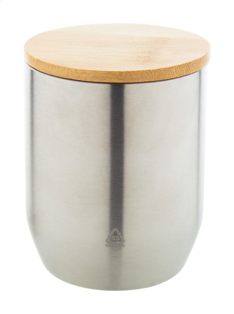Doppelwandiger Thermobecher aus recyceltem Edelstahl mit Bambusdeckel. Füllmenge: 300 ml.