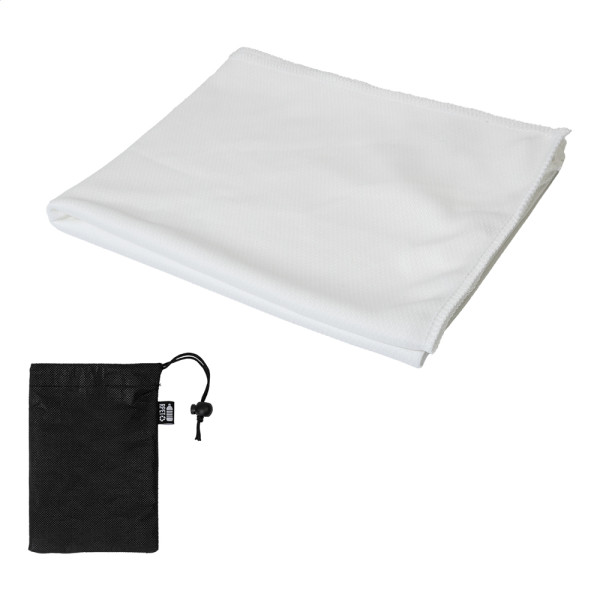 Sporthandtuch aus RPET-Mikrofaser in RPET-Vliestasche. Material: RPET-Polyester (140 g/m²). Mit Label RPET.