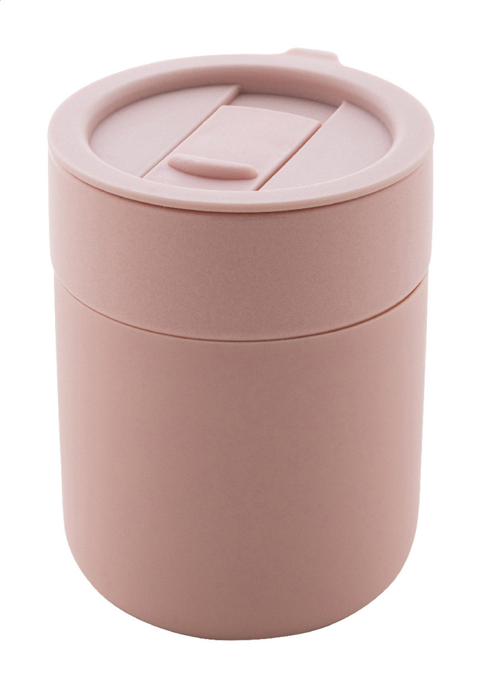Reisebecher aus Keramik mit Silikonummantelung mit Trinkdeckel aus PP Kunststoff. Füllmenge: 300 ml.