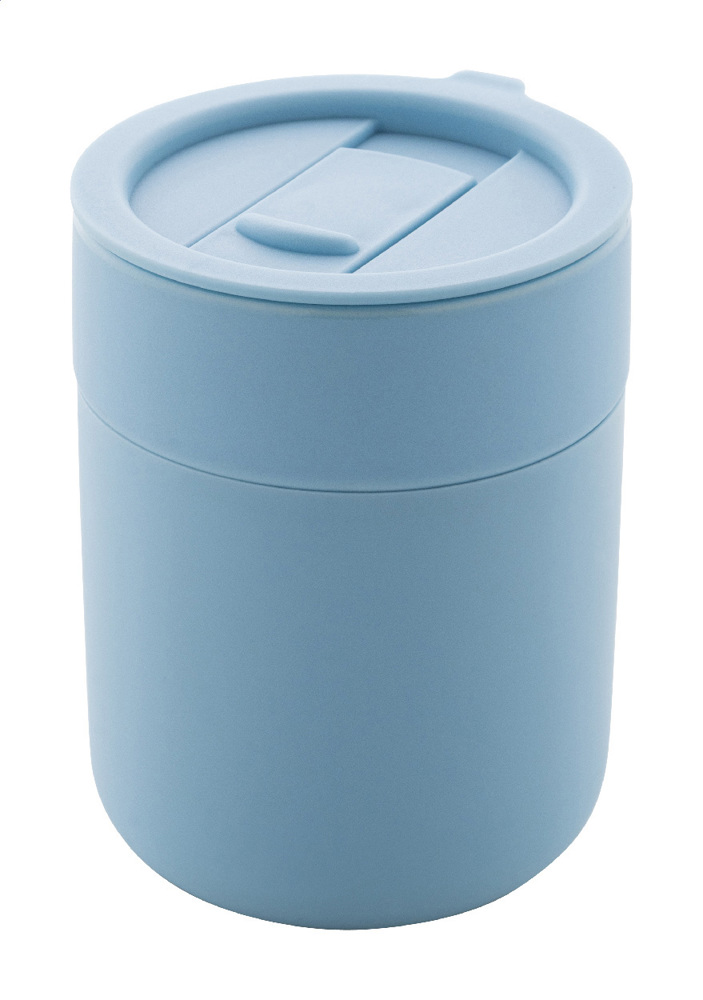 Reisebecher aus Keramik mit Silikonummantelung mit Trinkdeckel aus PP Kunststoff. Füllmenge: 300 ml.