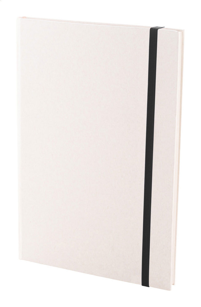 Notizbuch aus recyceltem Milchkartonpapier mit festem Einband, 80 linierten Blättern und farblich passendem Gummiband. Format A5.