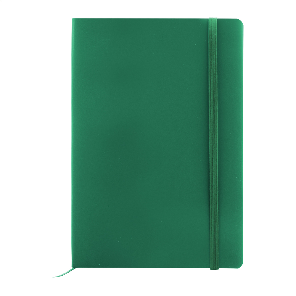 A5 Notizbuch aus recyceltem Kunstleder mit Softcover und 80 linierten Seiten aus Recyclingpapier. Mit farblich abgestimmten Lesezeichen und Gummiband.