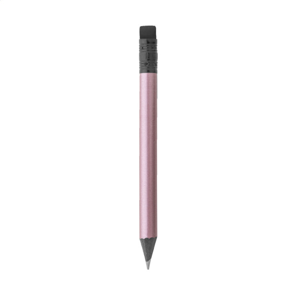 Minibleistift aus schwarzem Holz in Metallic-Optik, mit schwarzem Radiergummi. Gespitzt, Klasse HB. mehr