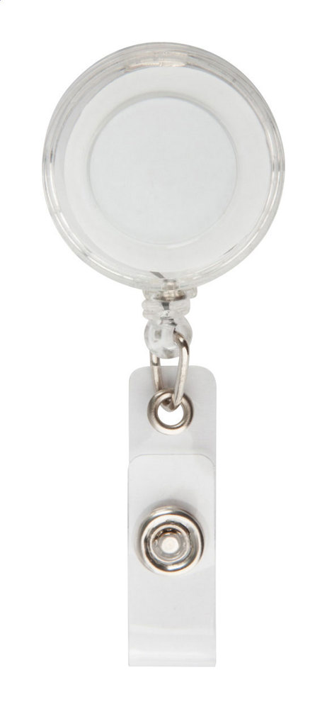 Ausweishalter mit Zugschnur und Druckknopf, aus transparentem Kunststoff.