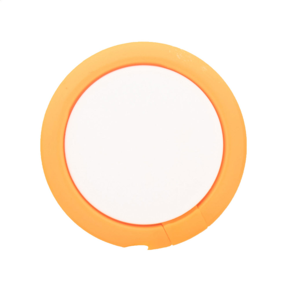 Runder Handyhalter aus Kunststoff mit selbstklebender Rückseite.